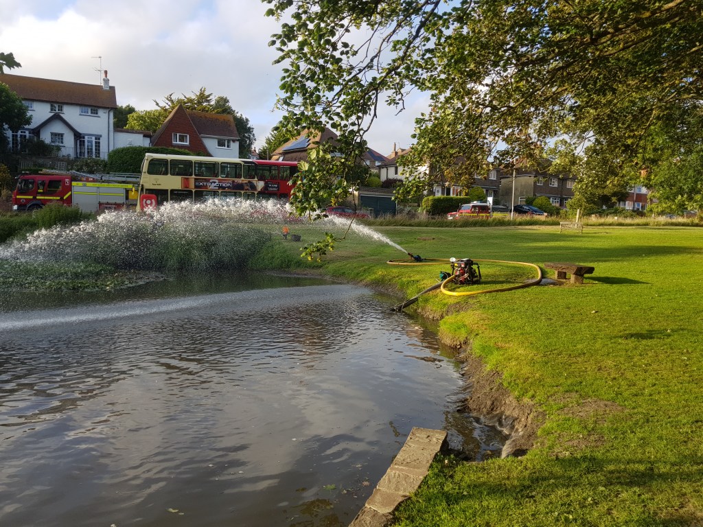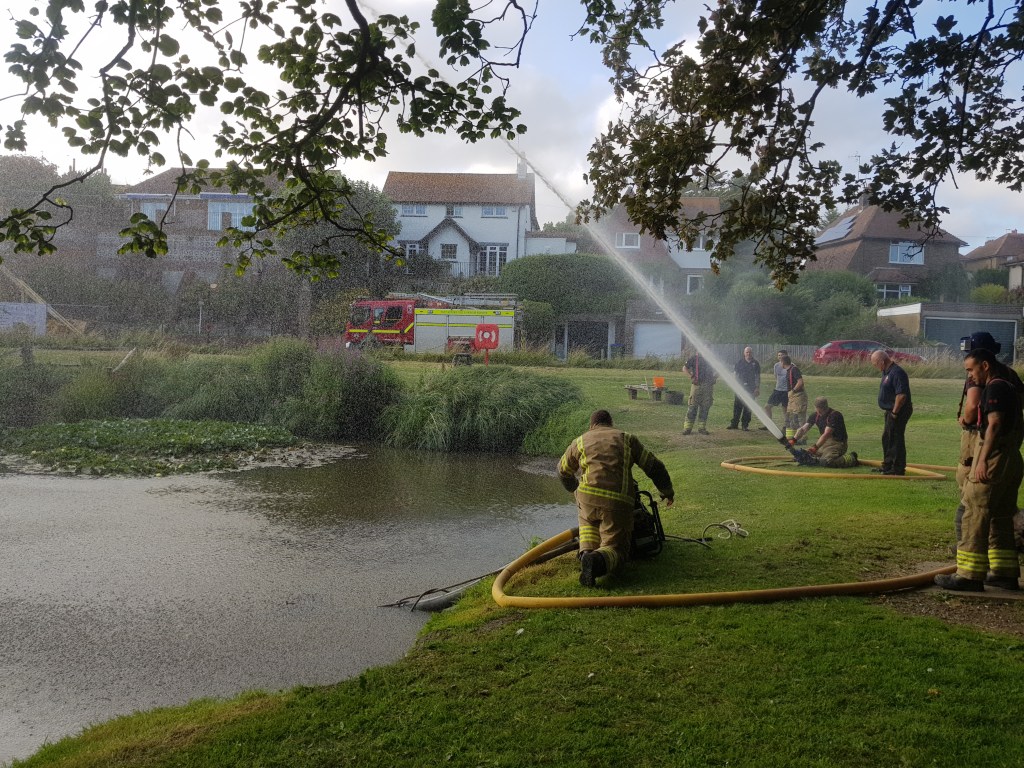 Last Weds, 12th July, we had a visit from the Seaford branch of East Sussex Fire and Rescue Service who came to rescue our fish from lack of oxygen in the water. As the weather gets warmer oxygen levels in the water drop, and we’ve had a report of the carp gasping for oxygen. Luckily we had already booked the date for the Fire Service to come down during their training session. They brought a very high-powered pump which they used to circulate the water back via an impressive fountain, which aerates the water. They ran the pump for around 50 minutes.