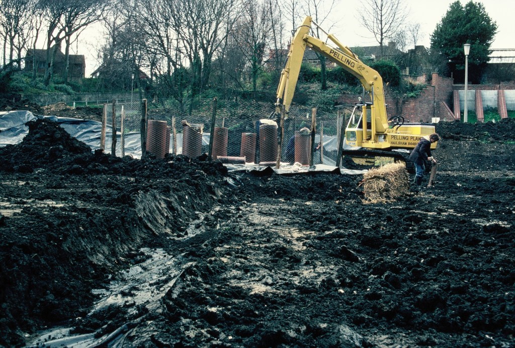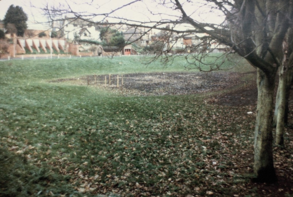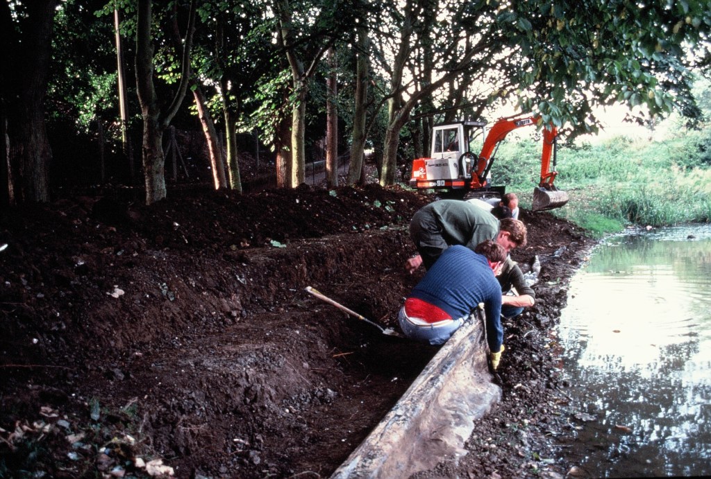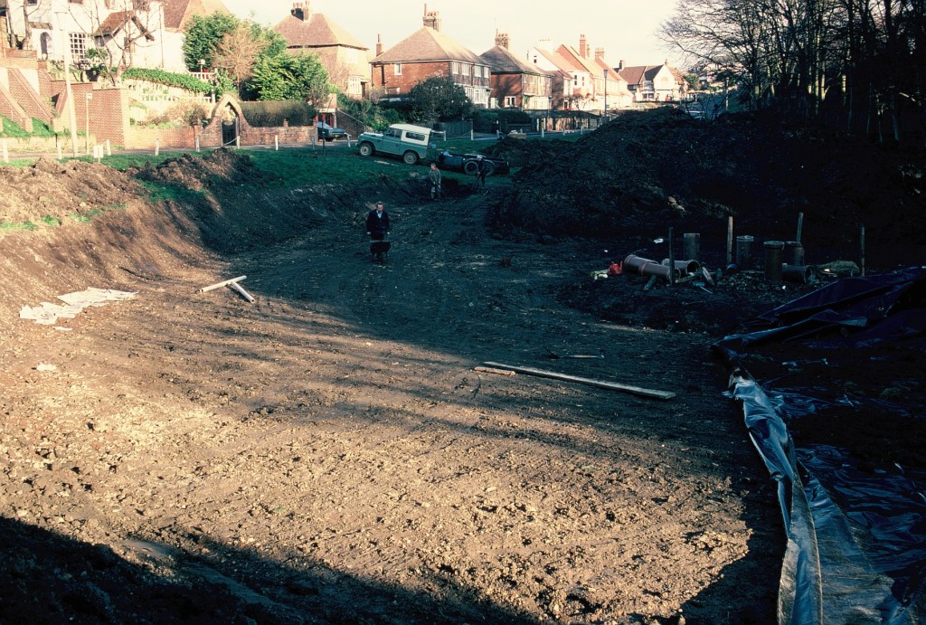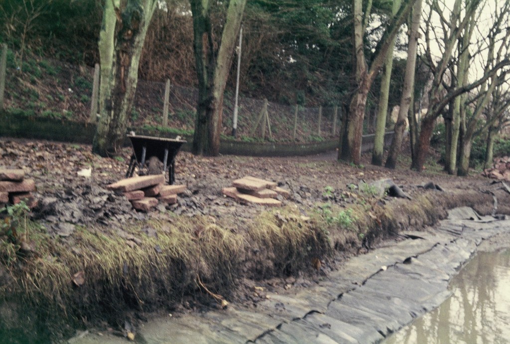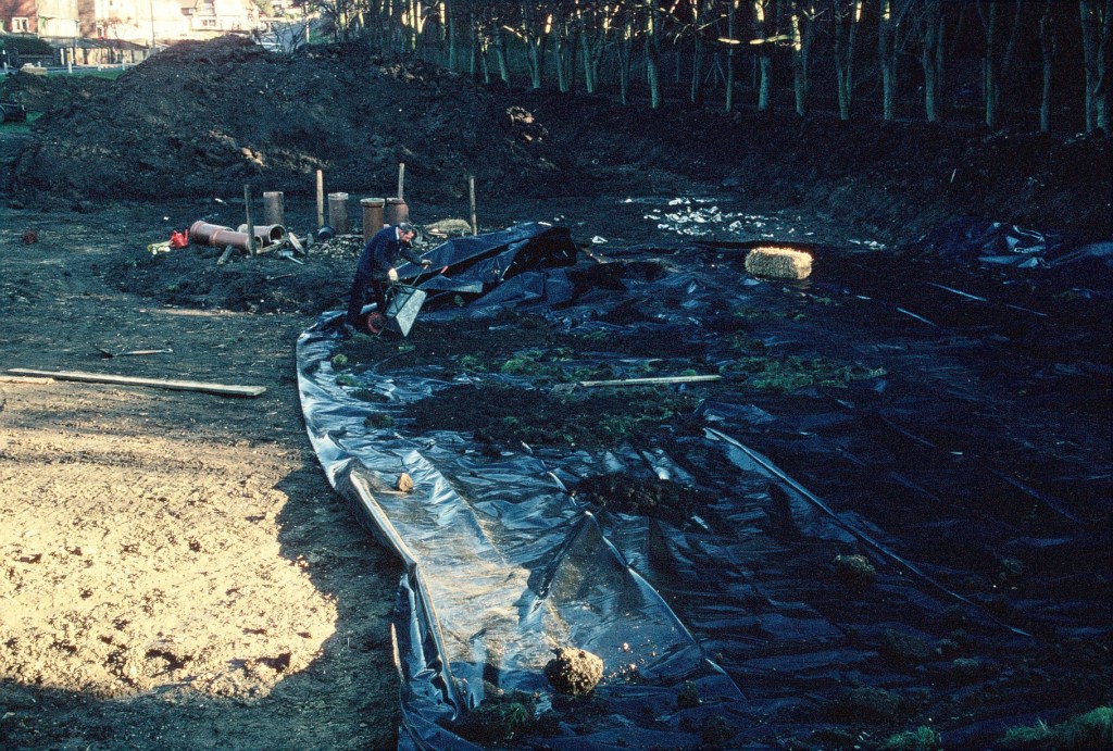 Work began in the winter of 1980 and the initial task was to stick together three rolls of heavy duty polythene to form the lining, which was done in a barn at the Seven Sisters Country Park centre. Using the farm seemed like a good idea at the time but the combined weight of the rolls was some 150 kilograms and lifting it all into a trailer for transporting to the site and out again without damaging it was no mean feat! An excavator was hired to remove the accumulated silt of many years and also the original clay lining which was banked up around the site, forming a mound 6 metres high. The daunting task of laying the polythene and covering it with turf began, with extra sheets being joined in situ. In all, an area of 64 x 28 metres had to be covered, so it was an enormous job, particularly as no more than ten people were involved. As soon as the turf had been laid, the final 45 centimetres of clay was backfilled by the machine. An island was formed at one end made of large pipes (kindly donated by the Forestry Commission) which were stood on end and surrounded by wire netting, the structure being covered with soil. By the end of the project, about 1,000 tonnes of soil had been moved and 215 square metres of polythene laid, involving about 75 man days of work.